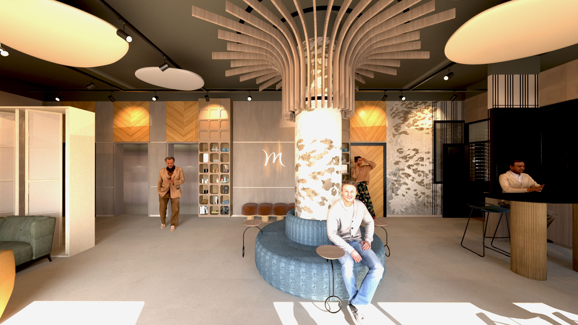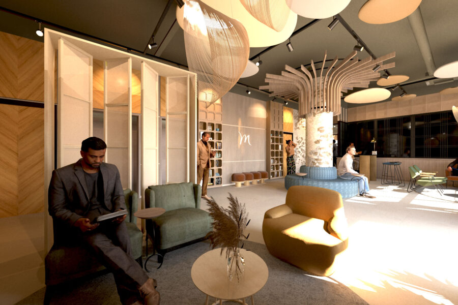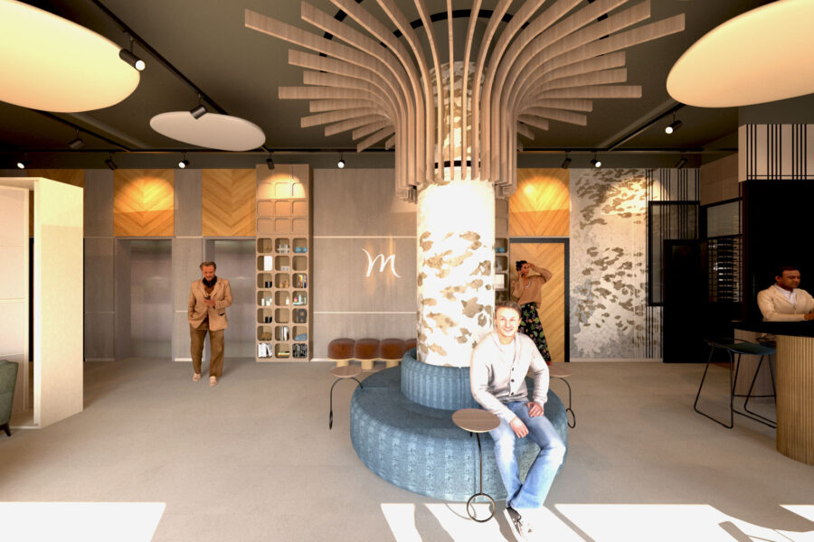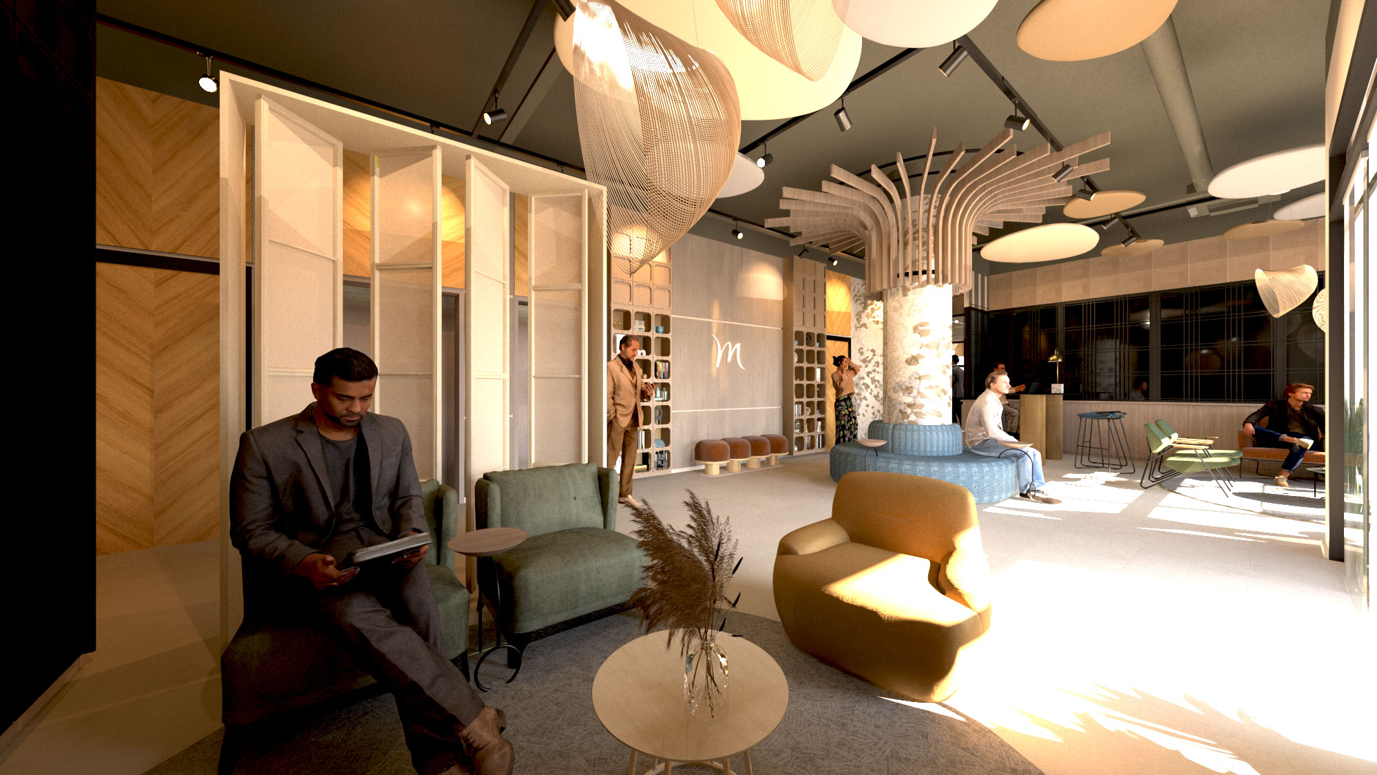 Nous avons puisé dans deux sources d’inspiration pour créer le caractère du hall d’entrée. Nous avons cherché à retrouver l’harmonie discrète de la banlieue de Nanterre, avec par endroits des bâtiments futuristes de caractère. Des touches de couleurs sourdes, des finitions naturelles mêlées à des formes typiques des années 70 et 80, en référence aux quartiers emblématiques de Nanterre et de la Défense. Par exemple, le panneau mural central du Lobby portant le logo Mercure est flanqué de deux bibliothèques en forme de tour dont les découpes font subtilement référence aux célèbres tours futuristes du quartier Aillaud.