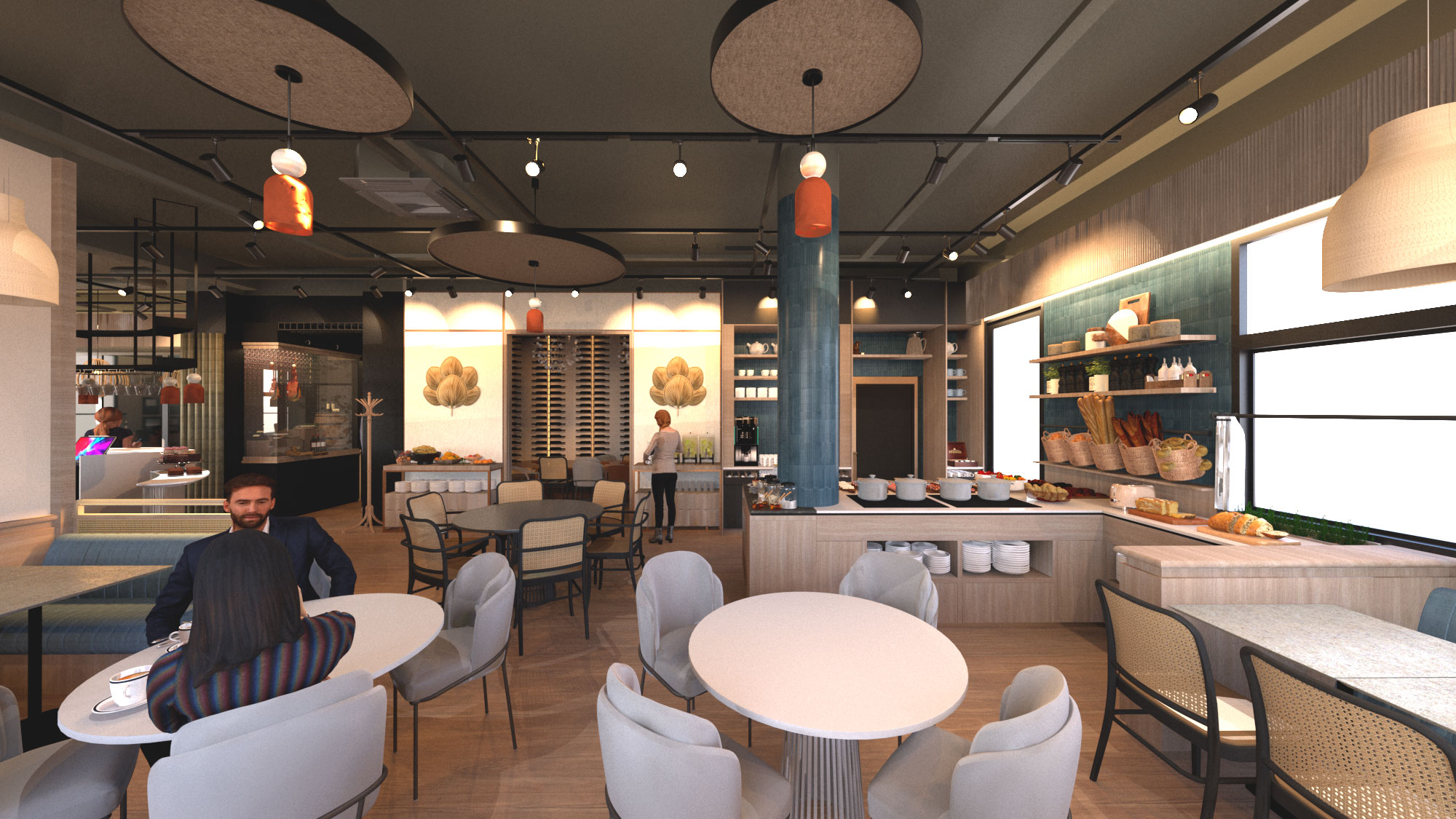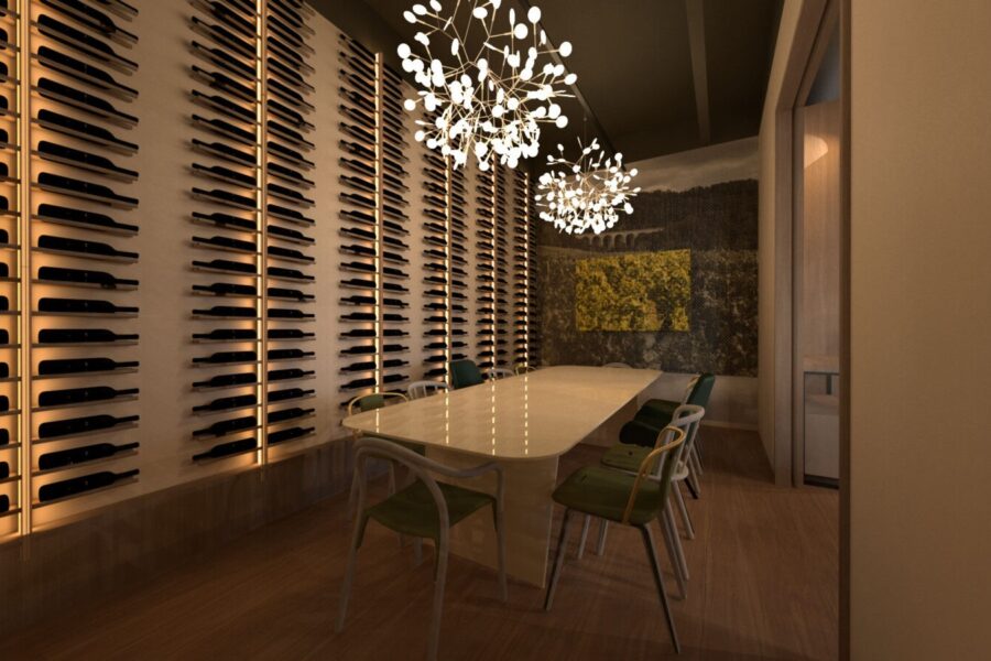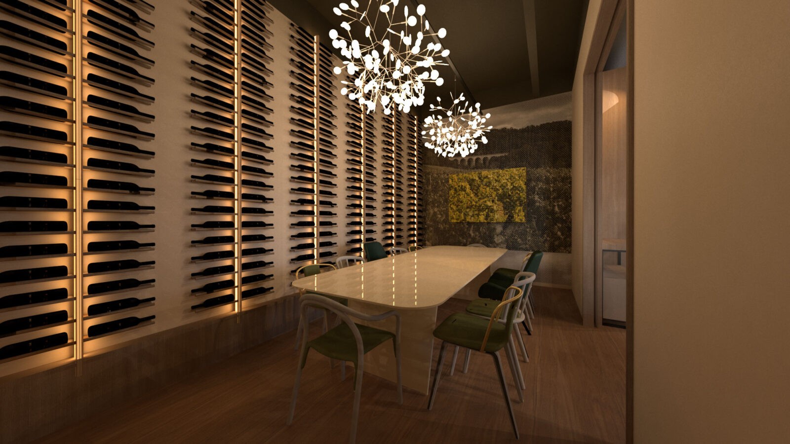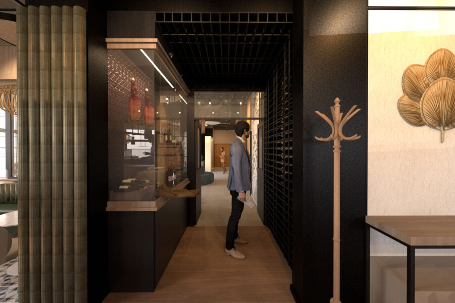 Pour le restaurant et le bar, la palette de couleurs et les rythmes de surface du hall d’entrée ont été conservés, mais le thème a été déplacé vers la gastronomie et le vin.