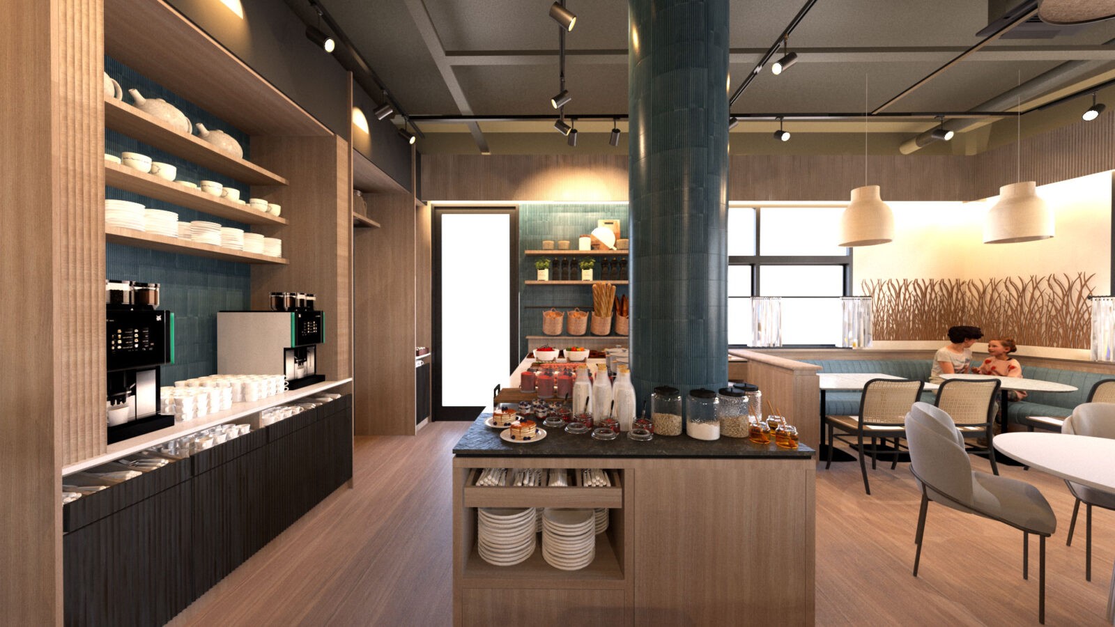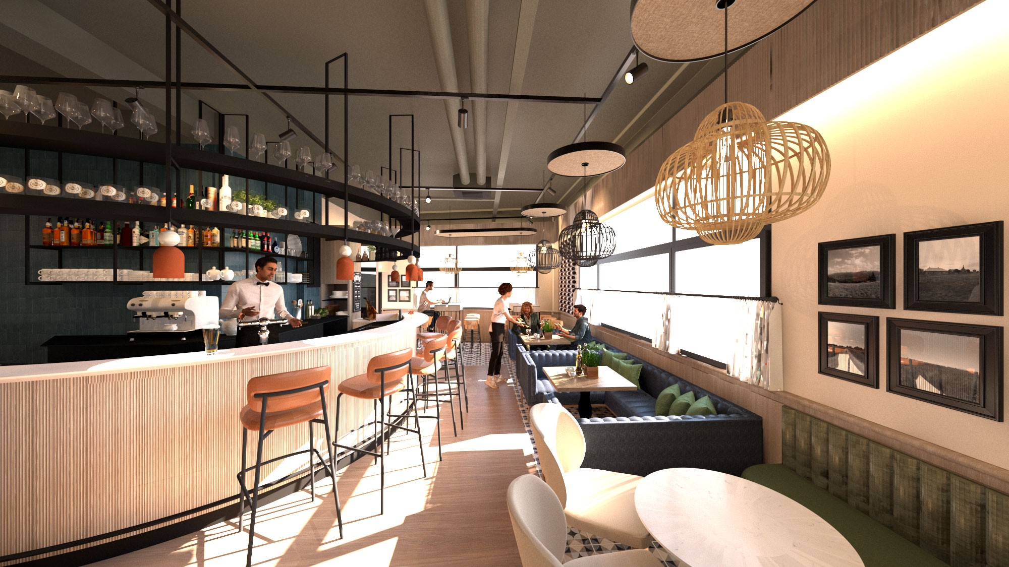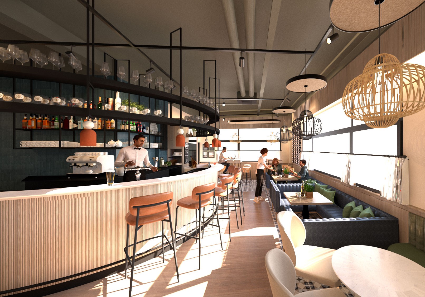 Pour le restaurant et le bar, la palette de couleurs et les rythmes de surface du hall d’entrée ont été conservés, mais le thème a été déplacé vers la gastronomie et le vin.
